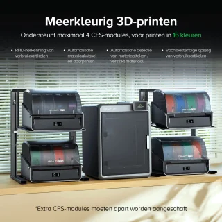 - Ondersteunde materialen: PLA, PETG, PET, ABS, PLA-CF (en oplosbare/bio-afbreekbare materialen via CFS)