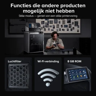 - Gebruiksvriendelijk: touchscreen, app-/Wi‑Fi-connectiviteit, ingebouwd geheugen (8 GB) en meertalige interface maken de workflow soepel — van slicing tot printen.