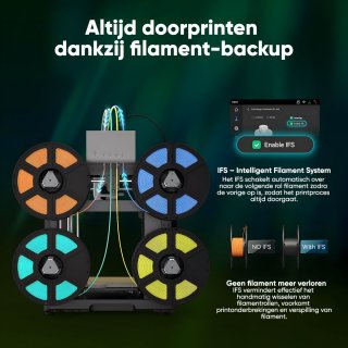 - Multicolor & multimateriaal — IFS ondersteunt tot 4 kleuren en een breed scala aan filamenten (PLA, PLA Pro, PETG, TPU, ASA, silk- en carbon blends). Creëer realistische prototypes, kleurrijke modellen en functionele onderdelen zonder gedoe.